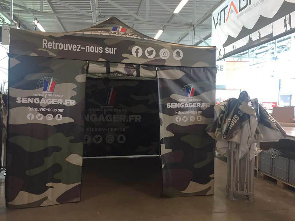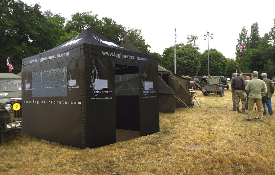 Das Faltzelt ist individuell gestaltbar: hochauflösender Druck, wetterfeste Markierung … Denken Sie daran, wenn Sie auf Veranstaltungen kommunizieren oder rekrutieren wollen.