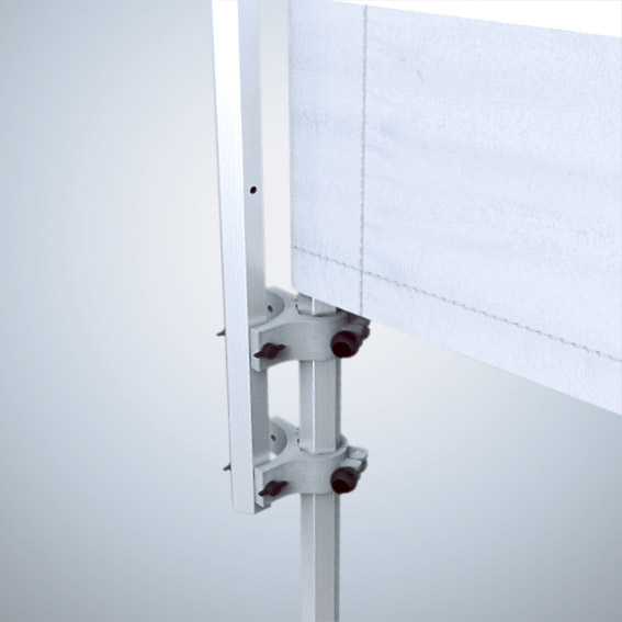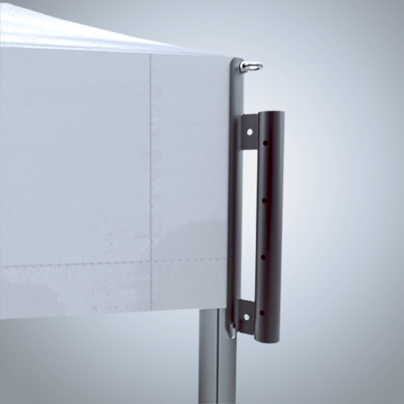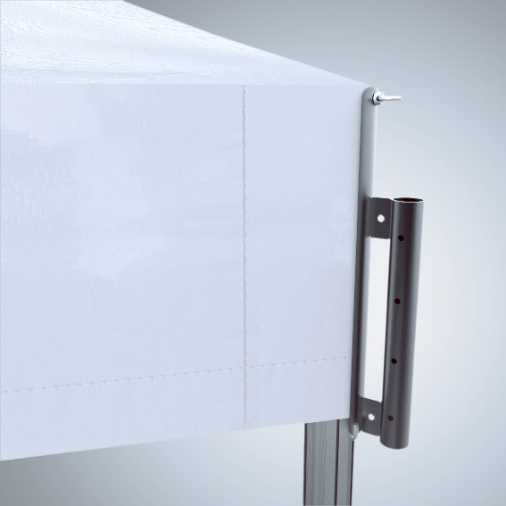 Verbessern Sie Ihre Sichtbarkeit mit dieser abnehmbaren Halterung, mit der sich die Textilfahne ganz einfach und ohne jedes Werkzeug am Fuße eines Vitabri-Faltpavillons befestigen lässt.